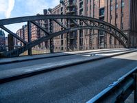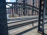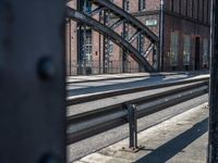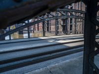 A view of the classic Deutschland architecture in Hamburg, featuring a mix of building materials such as brick, metal, wood, and glass. A cobble stone street leads to a warehouse along the canal, with vegetation, buildings, and a railway track in the background.