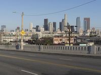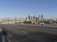 A stretch of highway and bridge in downtown Los Angeles, California, USA, connecting the metropolitan area with its urban cityscape and skyscraper skyline illuminated by the sun during the day.