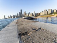 A view of the city of Chicago, Illinois, USA - with its iconic skyline, residential buildings, water resources, and recreational areas, viewed from a bridge over a river on a sunny day.