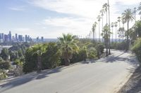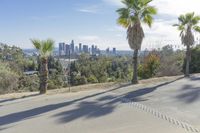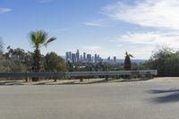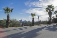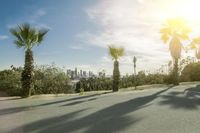 A view of a cityscape with an elevated highway and a lush Arecales palm tree, providing a unique blend of urban infrastructure and natural beauty.