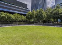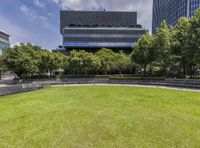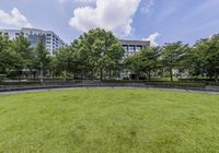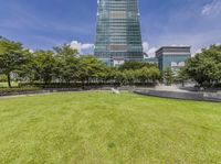A lush landscape of vegetation and modern architecture in the Xinyi District of Taipei City, Taiwan. The cityscape includes a mix of high-rise buildings, skyscrapers, botanical gardens, parks, and open spaces, creating a unique natural environment for city life, business, and leisure.