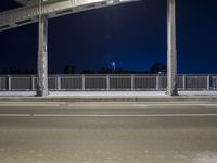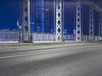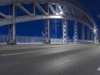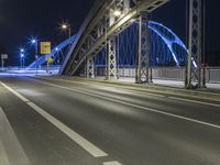 The skyline of Frankfurt, Germany is illuminated by street lights, vehicle headlights, and the light of a tied-arch bridge, as high speed traffic passes through the metropolitan area along a highway in the night.