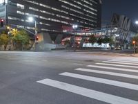 A mixed-use metropolis illuminated by the artificial light of a street lamp and the headlights of an automobile, zebra crossing and infrastructure creating a vibrant public space for pedestrians and modes of transport.