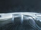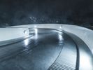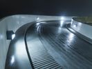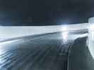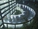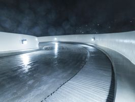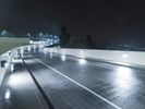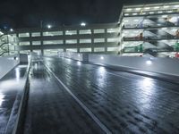 The metropolitan area of Los Angeles, California, USA is awash with modern architecture, concrete, water, flooring, glass, bridges, parking garages, reflections, streets lights, artificial lights, parking decks, entries and exits, highway entrances and exits, highway ramps, inclines, on-ramps, ramps, slopes, Armco barriers, barriers, asphalt, structures, infrastructure, steel, stadiums, and snow, all seen here on a wet night.