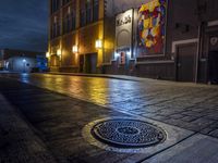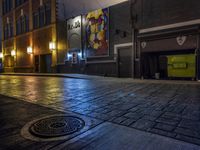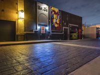 A view of the classic architecture and cobble stone flooring of the urban alley-way in Detroit, Michigan, USA, illuminated by the neon lights of the storefronts and street lights at night.
