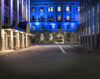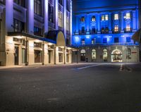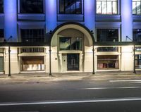 A straight road illuminated by street lights and artificial light leads through the bustling city of Wellington, New Zealand. The vibrant city life with shops, cafes, and storefronts creates a captivating urban scene at night in this low-profile business district.