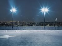 The skyline of Los Angeles, California, USA is illuminated by the artificial light of the night. A concrete highway entrance ramp curves upward in the foreground, as the clear sky of winter brings out the cityscape in the background. The parking lots, roads, and open spaces of the urban city are visible in the illuminated profile.