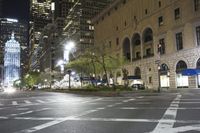 A view of an urban nightscape in New York City, USA, with a mix of modern and classic architecture, illuminated by artificial light from office buildings, street lights and crosswalks in a densely packed metropolitan area.