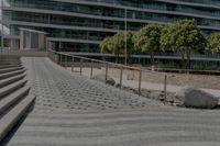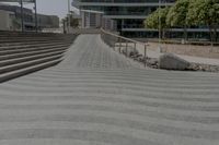 A view of the corporate headquarters in Abu Dhabi, United Arab Emirates. The scene combines the metropolitan area with the residential area, and includes a plaza, boardwalk, cobble stone walkway, tree, and a clear sky. The structure has a curved roof and walls, and the road surface is made with asphalt and pavers. The view is looking straight down the road and creates a sense of recreation.