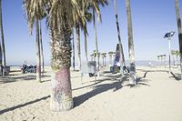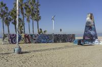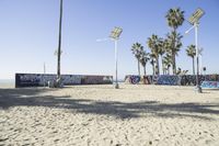A vibrant landscape of Arecales, beach volleyball, graffiti, mural, open space, palm tree, street art, street light, summer, tourism, and urban vegetation is captured in the coastal shore of Venice Beach, Los Angeles, California, USA. A cloud-filled sky, rugged sand, and clear ocean water complete this sunny summer day.
