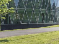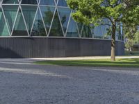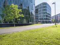 A view of Frankfurt, Germany with its modern architecture, open spaces, and business district. The yellow leaf trees, roads of asphalt and dirt, metal and concrete structures, and corporate headquarters create an urban landscape with a diverse array of infrastructure and vegetation, from courtyards to parks, against a clear sky with contrails.