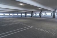 A view of an urban public space, with a parking lot, concrete and asphalt floor, and lanes leading straight down the road. This could be an airport or city parking garage.
