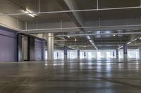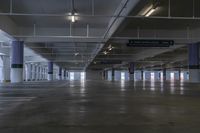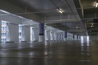 A view of the open space in Los Angeles, California, USA, with its architecture, columns, concrete surface, flooring and artificial light. The parking deck and parking lot provide a unique urban experience in the city.