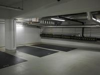 A view of an urban parking garage in the bustling city of Los Angeles, California, USA. The concrete floors, glass walls, and artificial light create a modern and sleek ambiance for drivers to park their vehicles.