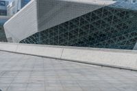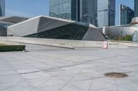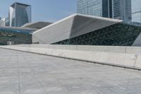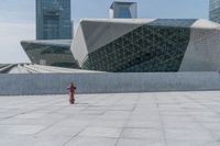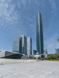 The modern architecture of Guangzhou, Guangdong, China is highlighted by the cityscape, open spaces, and futuristic concrete structures that line the straight road in the foreground. The day is clear, with one quarter of the sky filled with clouds, and a fire hydrant visible in the low profile wall in the background.