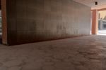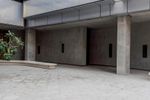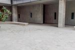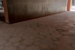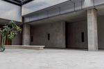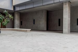 A view of the open plaza and facade of a modern condominium in Abu Dhabi, United Arab Emirates. Paved walkways, glass windows, and tiled floors create an inviting urban interior design.