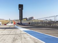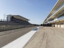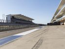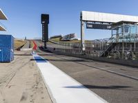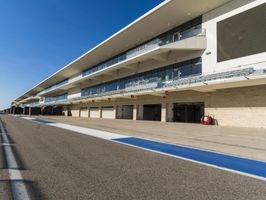 A grandstand overlooks a metropolitan area's race track and the infrastructure of airport, train station, and roads that lead to the city. Automobiles race around the asphalt and concrete track lined with guard rails and pit lanes, while the clear sky and winter air create a chill in the quarry.