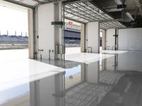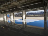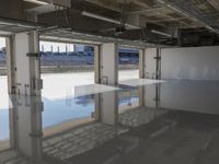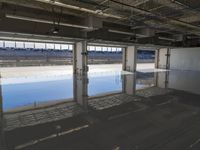 A view of a concrete structure with a glass dome roof in an urban race track, with a reflection of the parkings lot and a race car in the water below.