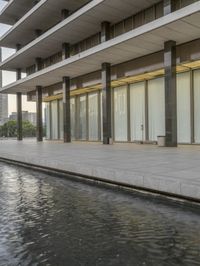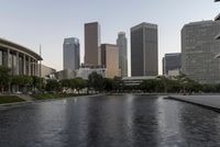 A view of the Los Angeles city skyline at dawn, featuring a mix of residential, corporate, and mixed-use architecture, with reflections of the city's glass and asphalt surfaces illuminated by artificial light.