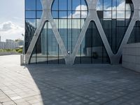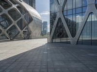 A modern cityscape of Shenzhen, China, featuring a bridge, skyscrapers, and a road surface of concrete and iron. The open space and tree provide a contrast to the hard shadows and abstract facade of the city's futuristic architecture. Tourists flock to this metropolitan area to witness its unique appeal and symmetrical profile.