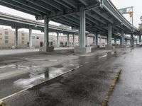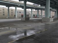 The metropolitan area of San Francisco is seen from above, with its roads, parking lots, buildings, and nonbuilding structures reflecting off of the wet road surface. Concrete bridges, steel columns, curb walls, and viaducts are seen throughout the city, as well as open parks, parking decks, and train stations.