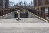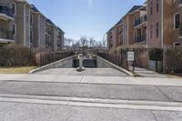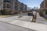 A view of a residential neighborhood in Toronto, Ontario, Canada, with houses, buildings, and vegetation along an asphalt road. The clear sky and urban design contribute to the city life atmosphere.