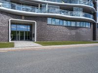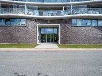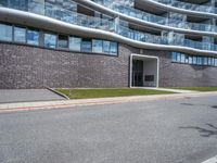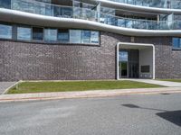 A view of a modern high-rise condominium in Bremen, Germany. The building features a composite material facade, a brick wall, and a variety of vegetation on the curb. The urban design of the city features a variety of residential areas, office buildings, and road surfaces made of asphalt and tar. This image conveys the beauty and symmetry of city life in Europe.