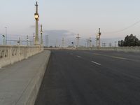 A highway with fixed link infrastructure, guard rails, and a boardwalk walkway is visible in the early morning light, as the urban skyline of the city fades into the sea and is dotted with street lights and contrails in the sky.