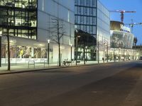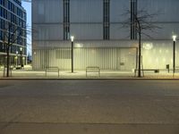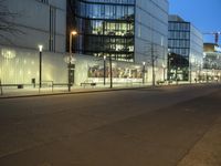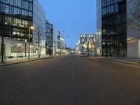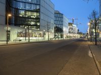 A view of a modern urban road in Berlin, Germany, at dawn. The road is lined with trees, buildings, and street lights, and the asphalt is illuminated by the artificial light from the office buildings in the business district. The cityscape provides a glimpse of the city life in this metropolitan area of Europe.