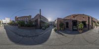A view of an urban residential area on a sunny day, with a building featuring a brick facade, a tree, and a door profile visible in the foreground. Asphalt on the road and the curb can be seen in the background.