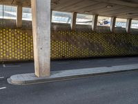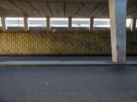 A composite material, asphalt road surface showcasing a rolling pattern of grey tints and shades in the Netherlands, Europe. The curved facade of the building has a metal grille and beam, and a parking space with a concrete floor and wood fence. A bridge, gas fixture, public space, and glass door all speak to the metropolitan area's urban design.