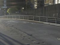 A view of an urban city street during the day, showing the asphalt road surface, guard rails, lane lines, automobile, and fencing structures.