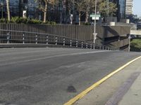 A city street with a road surface, guard rail, and walkway lined with a wall on a sunny day.