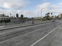 A curving highway with a guard rail, asphalt road surface, and bridge structure passes through an urban residential area, lined with trees. Automobiles and other vehicles can be seen racing along the thoroughfare on this sunny day.