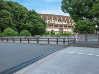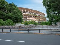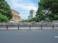 A busy city road with an office building and sport stadium in the background, in Tokyo, Japan. The asphalt street is surrounded by urban design and cloudy skies.