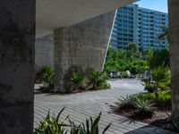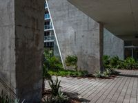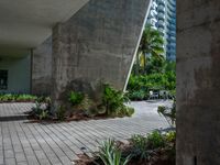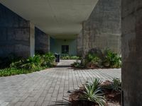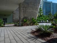 A paver surfaced street stretches straight down the road in the clear skies of Miami Beach, Florida, USA. Traditional residential houses and hotels are part of the urban design of this city.