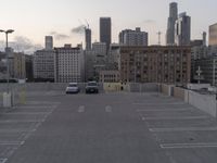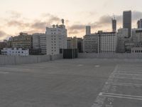 A view of the downtown skyline at dawn, with city buildings, roads, parking garages, and other infrastructure visible in the metropolitan area.
