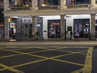 A snapshot of mixed-use development in the city of Hong Kong, China, featuring classic architecture, artificial light, public spaces, and a tree-lined road crossing. The night scene reveals silhouettes of people crossing the street and the reflection of the low buildings in the asphalt flooring.