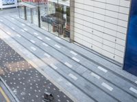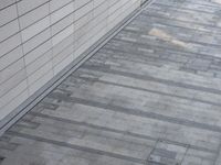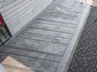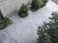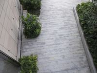 A top-down view of a modern urban scene in Shenzhen, Guangdong, China, featuring a composite material walkway lined with asphalt and grass, concrete curbs, brickwork, and a variety of residential and business buildings with wood siding, beige walls, and metal roofs.