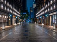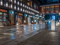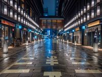 Straight down the road in Nihonbashi, Tokyo, a wet paver glistens under artificial light from the storefronts and street lamps, creating a unique urban design at night.