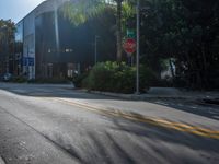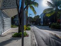 The sun casts a hard shadow over the modern architecture of the stores and shops of Miami Beach, Florida, USA in the bright, sunny day.