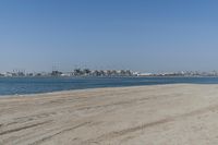 The coastal shoreline of Abu Dhabi, UAE, is shown with a clear sky, sandy beach, and construction near the harbor. The lake, ocean, and open space provide an urban yet suburban feel to the landscape.