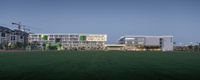 A stunning view of the urban skyline at dawn in Chongqing, China, with residential houses, office buildings, and open spaces surrounded by clear skies and lush green grass surface.
