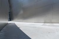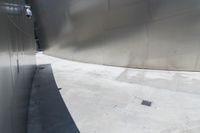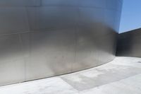The skyline of Los Angeles, California in the USA is illuminated by the bright sun, with air travel and aerospace engineering in the background. The cityscape is comprised of monochromatic and futuristic architecture featuring skyscrapers, handrails, glass windows, and asphalt roads, with a clear blue sky overhead and a reflection in the water below.