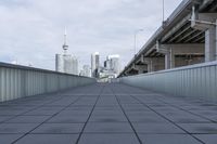 A panoramic view of a modern city skyline with high-rise buildings, roads, and infrastructure amidst a grey sky.