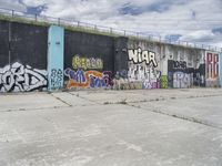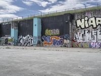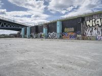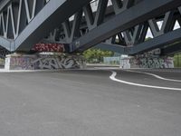 A concrete road and bridge in Hamburg, Germany, with a graffiti mural adorning a factory wall. The wheel of a car in the foreground brings life to the urban design, with a clear sky above a modern architecture and a river in the background.