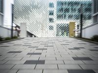 The modern architecture of Berlin, Germany is on full display in this shot of the city's urban design. A straight line of trees leads the eye down the walkway, while the white tile, wood flooring, and motion blur of the road surface create a feeling of motion and life in this European city.