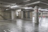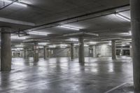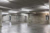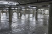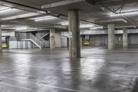 A view of the city of Los Angeles, California, USA from an elevated parking garage, featuring a symmetry of lines, asphalt, wood, metal, cement, concrete, tile, and artificial light.