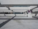 A straight and elevated view of Miami Beach, Florida, USA, from a high position, showing urban design elements such as a parking lot, concrete surfaces, and open spaces contrasted against the cloud filled sky.