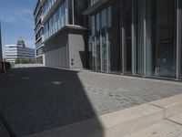 A modern cityscape of Duesseldorf, Germany, is featured in this photo. The infrastructure of the city is highlighted with a mix of buildings, roads, and open public spaces. The clear sky and open facade of the structure provides a view of the city's modern architecture and urban transformation.